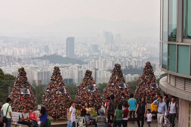 Our second destination: Namsan Tower. I had been before, but I had taken the bus both times, so this time, we took the shuttle thingy... man how do we call that thing already? Anyways, that lil thingy moving on cables, that brings you to the top. My mom is afraid of heights, so she had a hard time, but travels are for going over your fears aren't they?